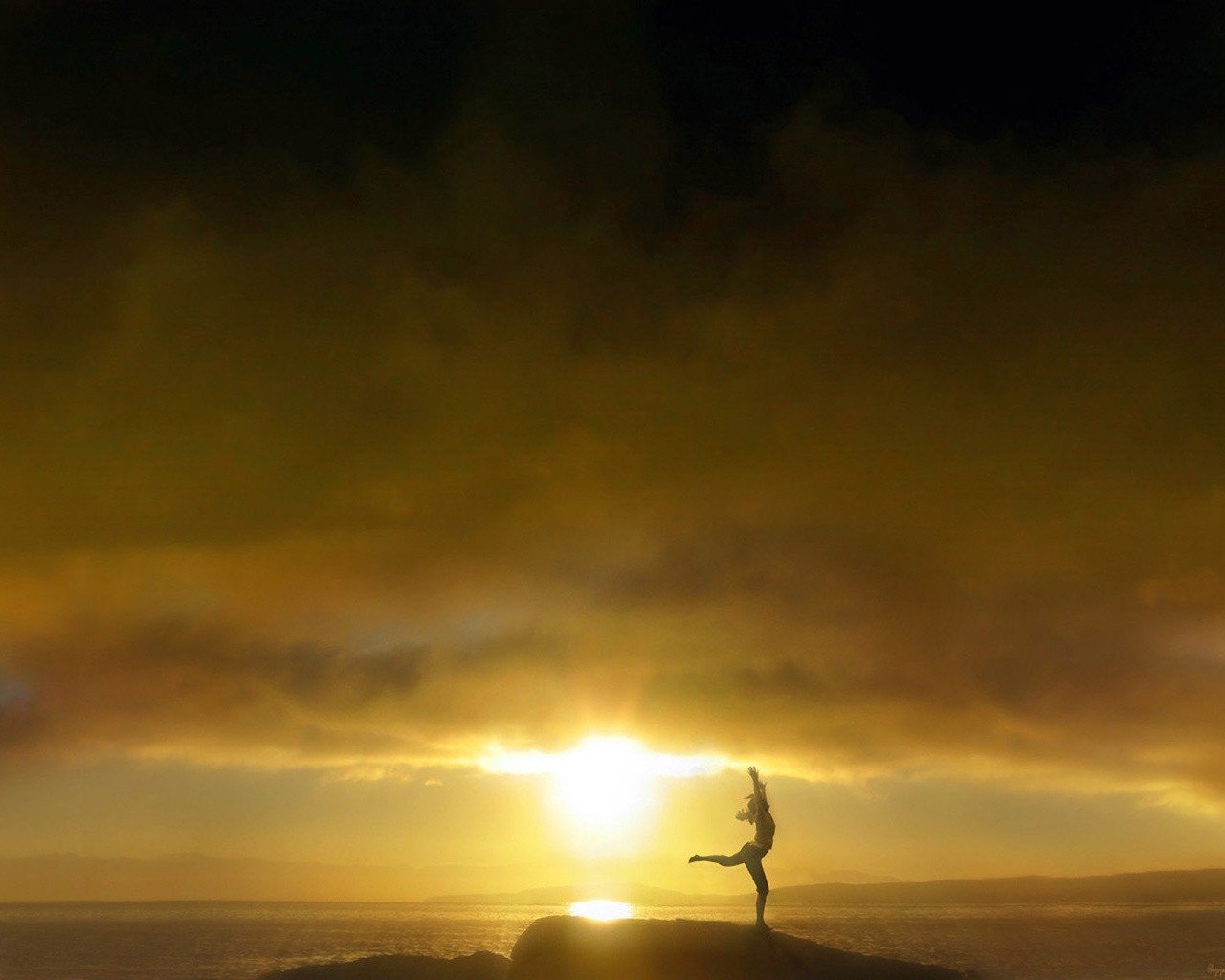 Silhouette d'une jeune fille faisant du yoga dans les rayons du soleil couchant