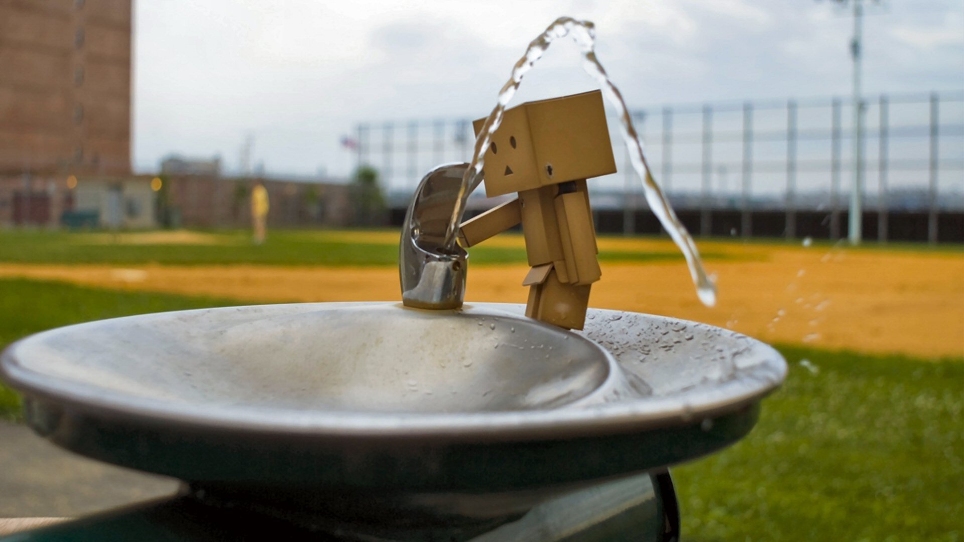 Un homme en boîte boit de l'eau d'une fontaine