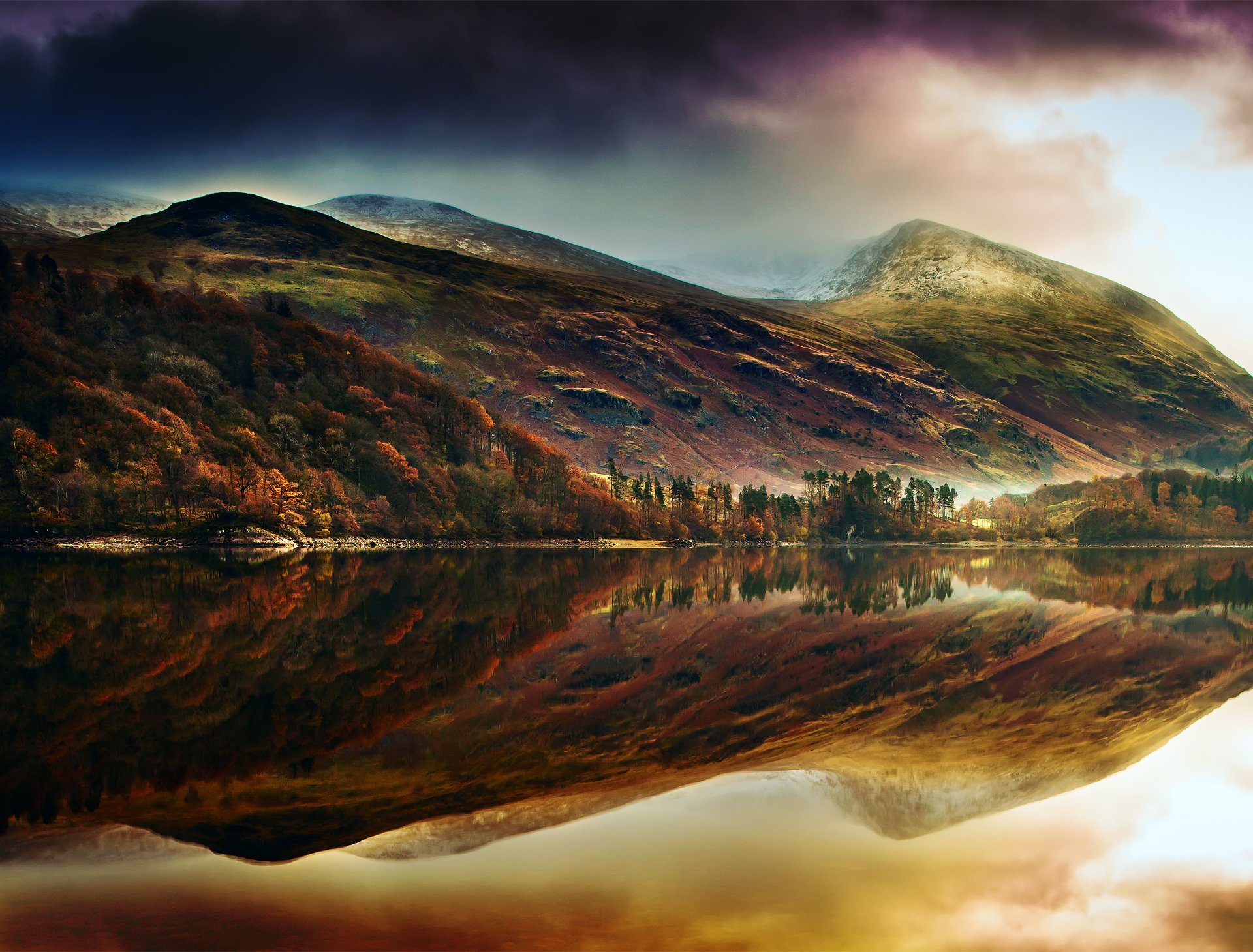 Coucher du soleil. Reflet des collines dans la surface du lac