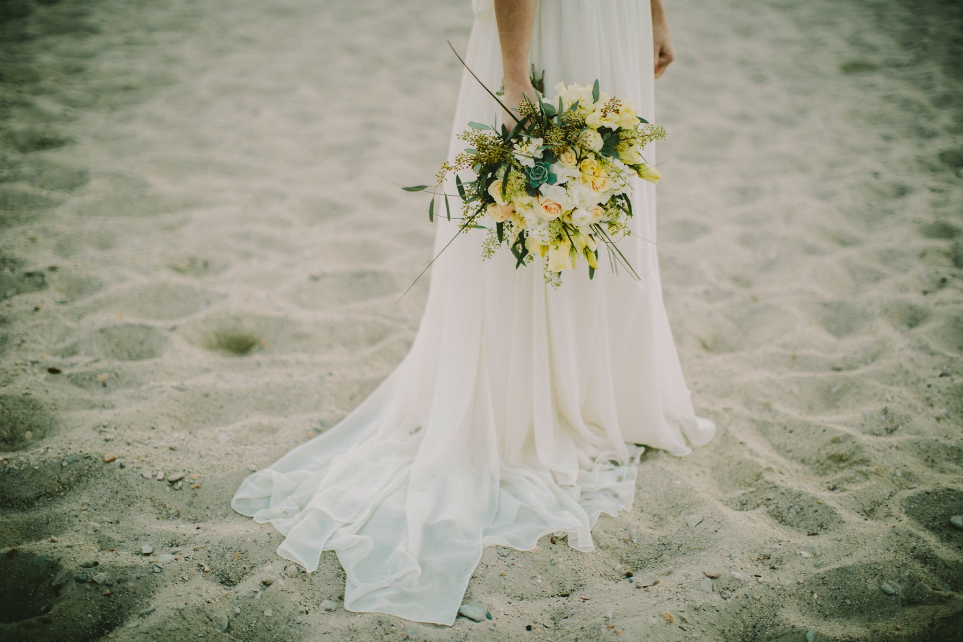 Mariée avec un bouquet lumineux sur la plage