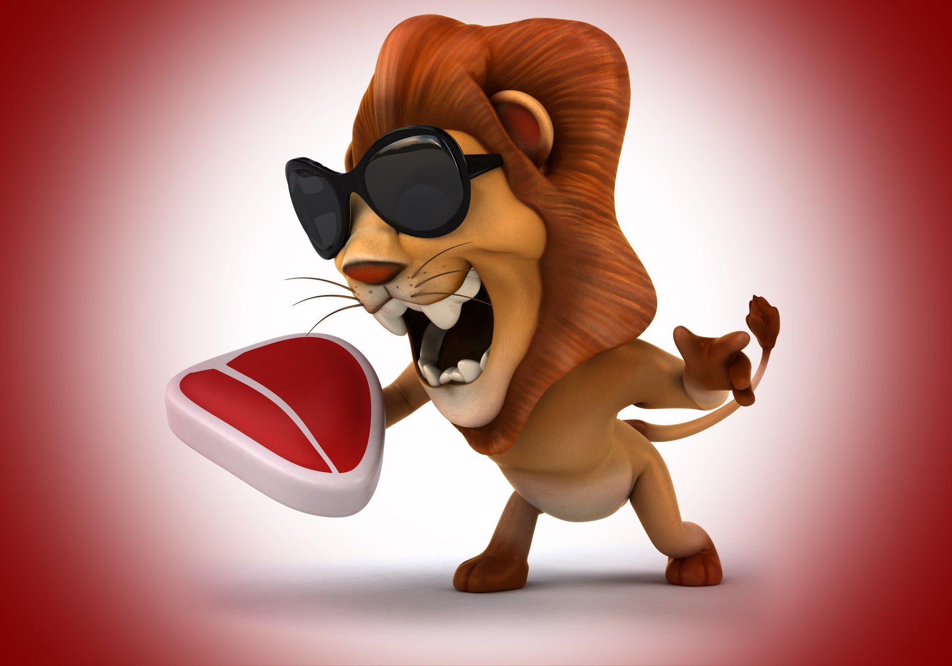 Le lion de lunettes, un super personnage. la viande est la nourriture pour le lion