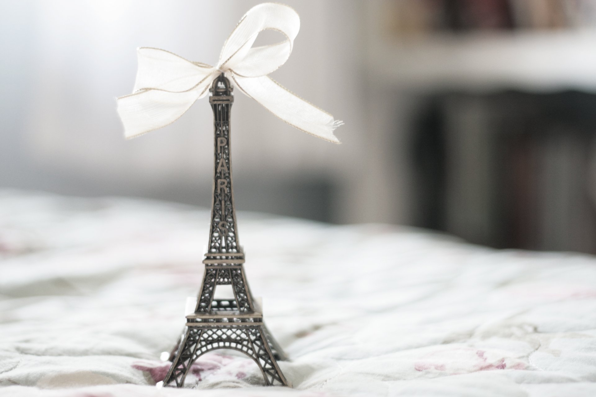 Boîte-cadeau dans un emballage doré avec un arc doré sur fond de taches de lumière multicolores