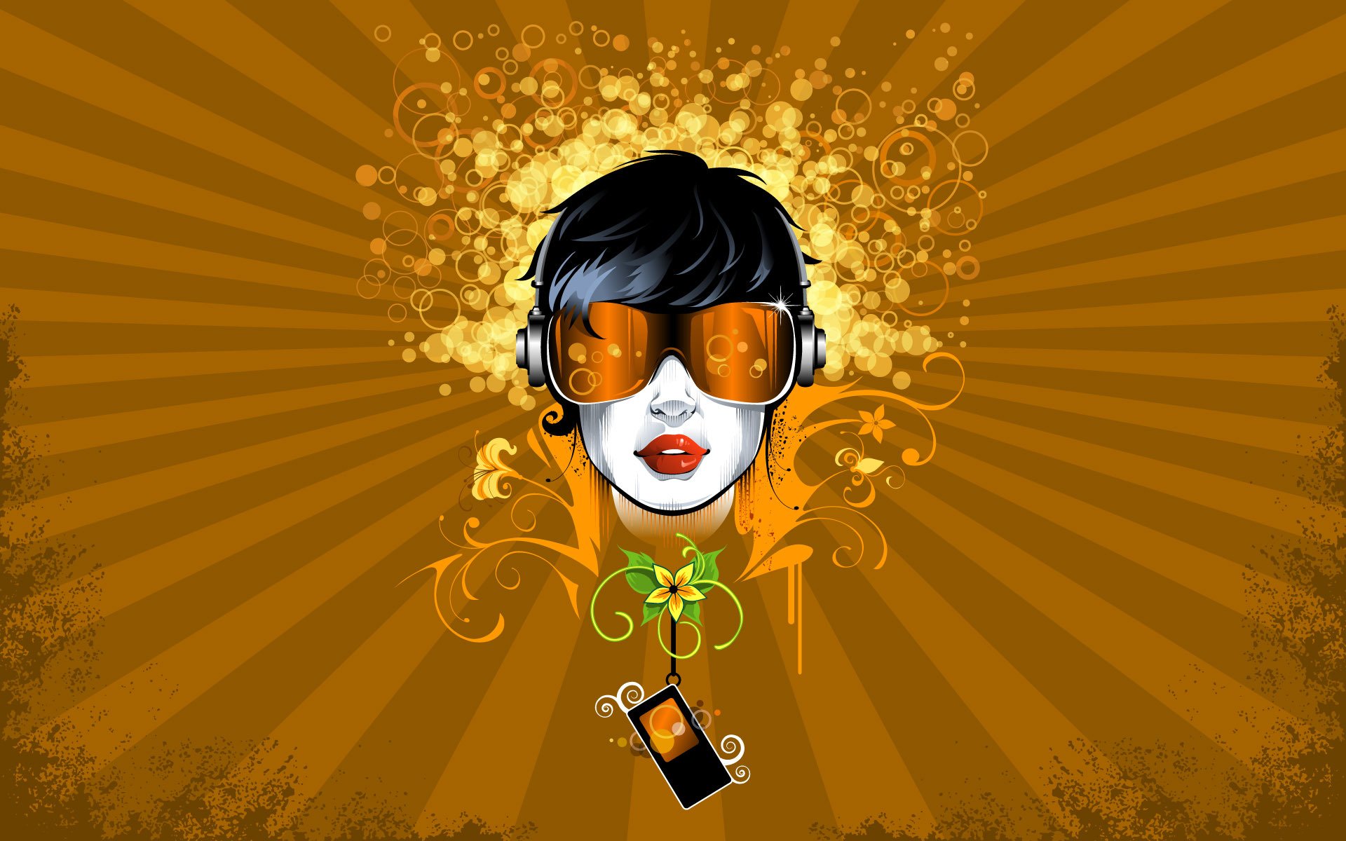 Dessin abstrait avec tête de modèle à lunettes et lecteur walkmanDessin abstrait avec tête de modèle à lunettes et lecteur walkman