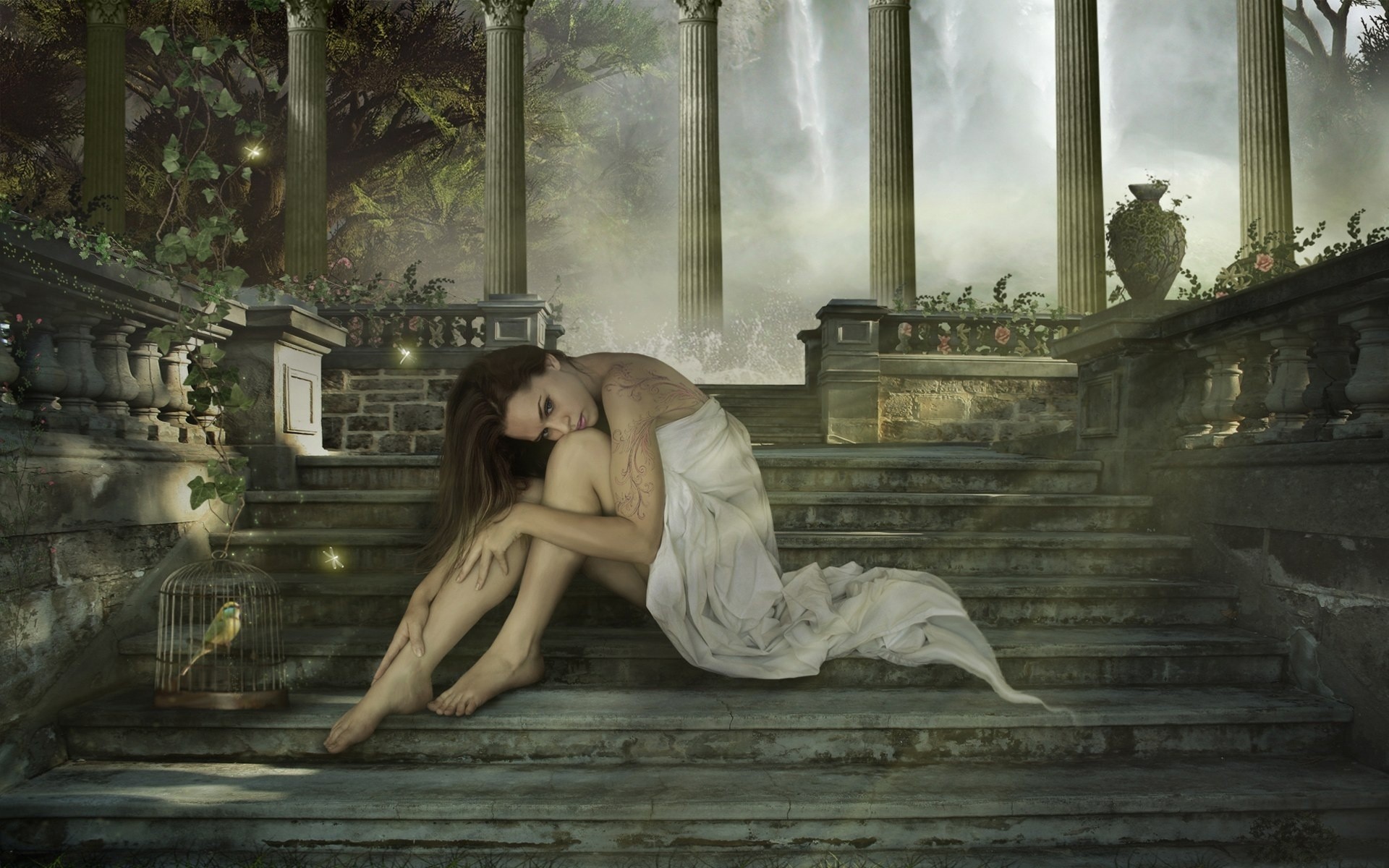 Fille avec un oiseau sur les marches près de la colonneFille avec un oiseau sur les Marches près de la colonne