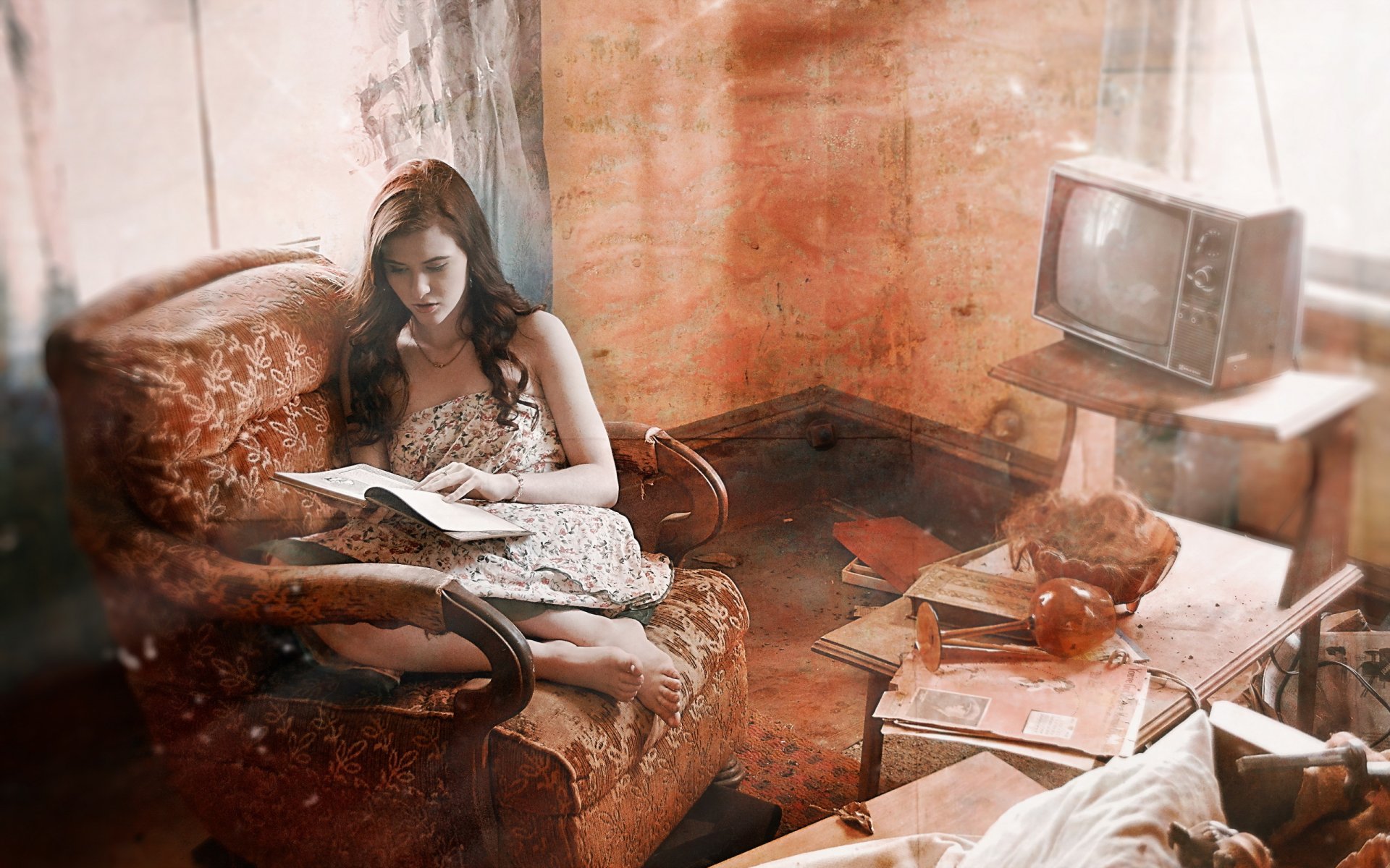 Fille en robe blanche s'accroche à une corde avec des pinces à linge feuilles de livre, tout se passe dans la forêt