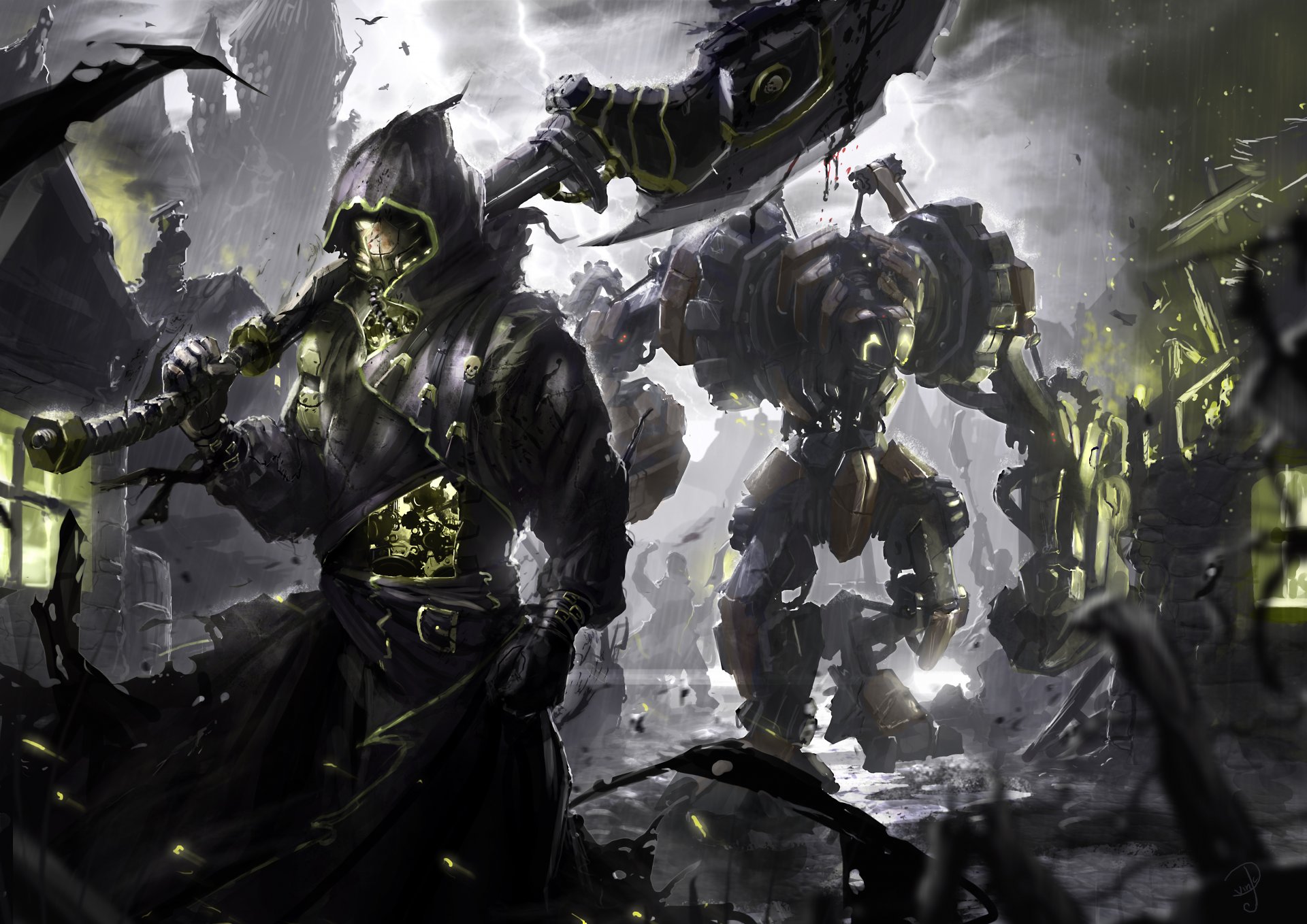 Guerrier à capuche avec des armes