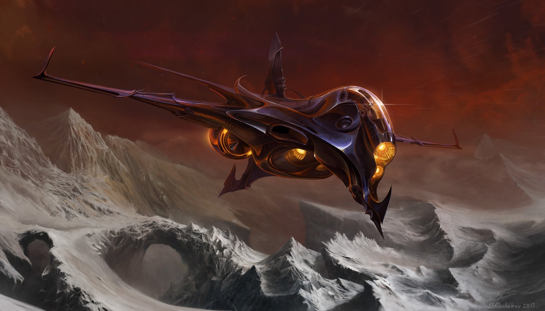 Sky-Fi navire volant sur un terrain enneigé montagneux