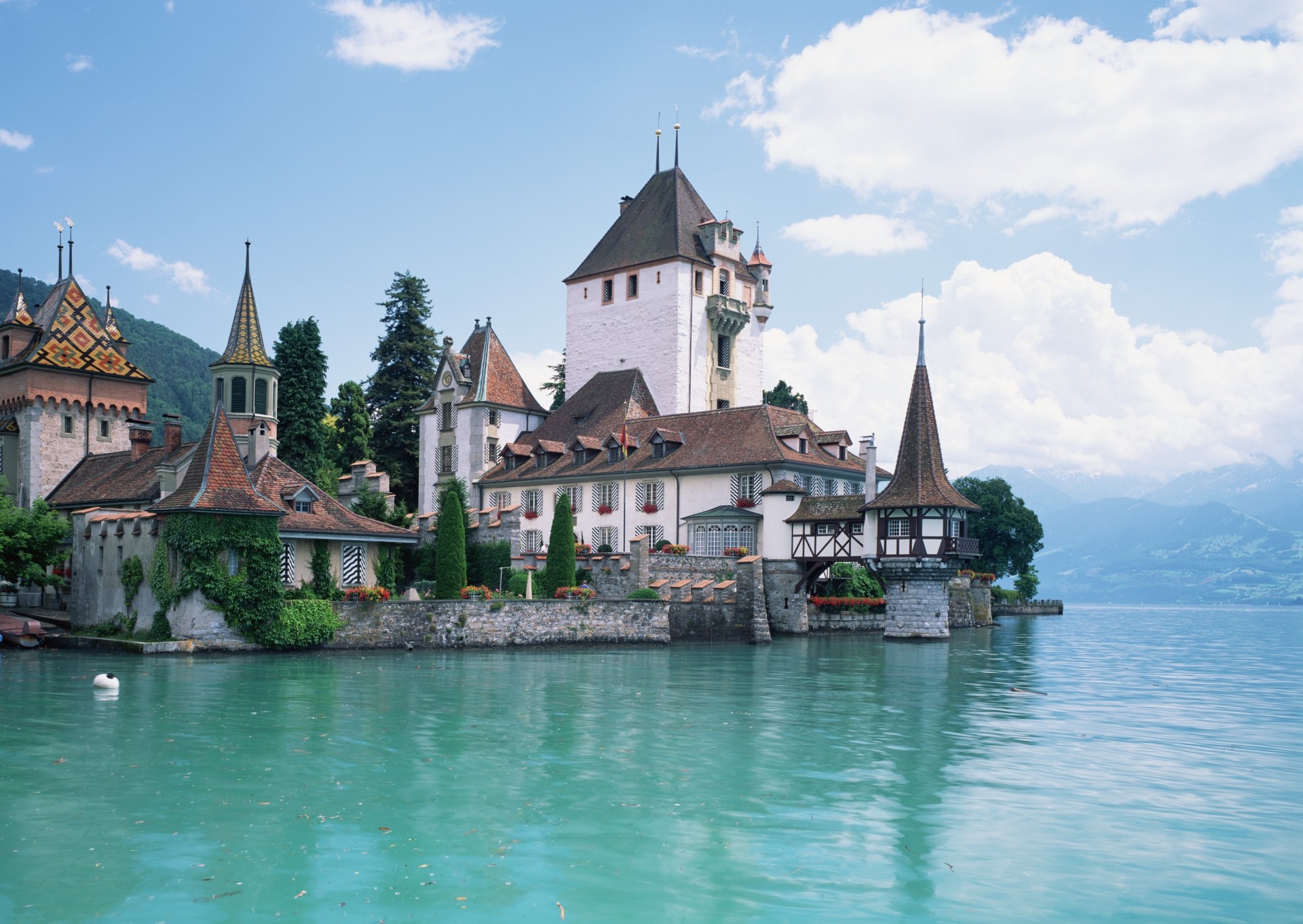 Rivière et maisons au bord du lac parmi les montagnes en autricheRivière et maisons au bord du lac parmi les montagnes en Autriche