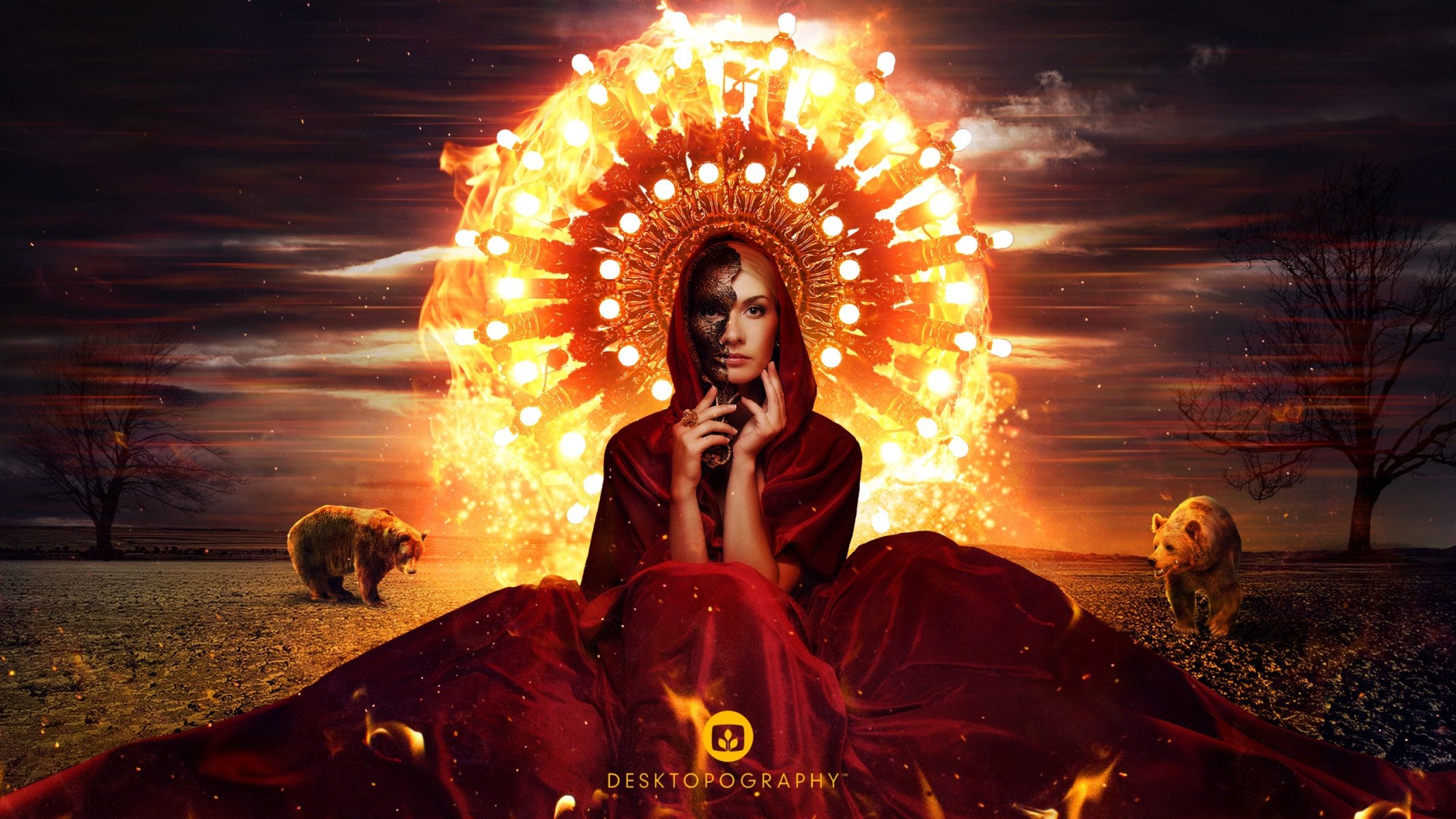 Fille mystérieuse dans un manteau sur un fond d'ours et de feuFille mystérieuse dans un manteau sur un fond d'ours et de feu