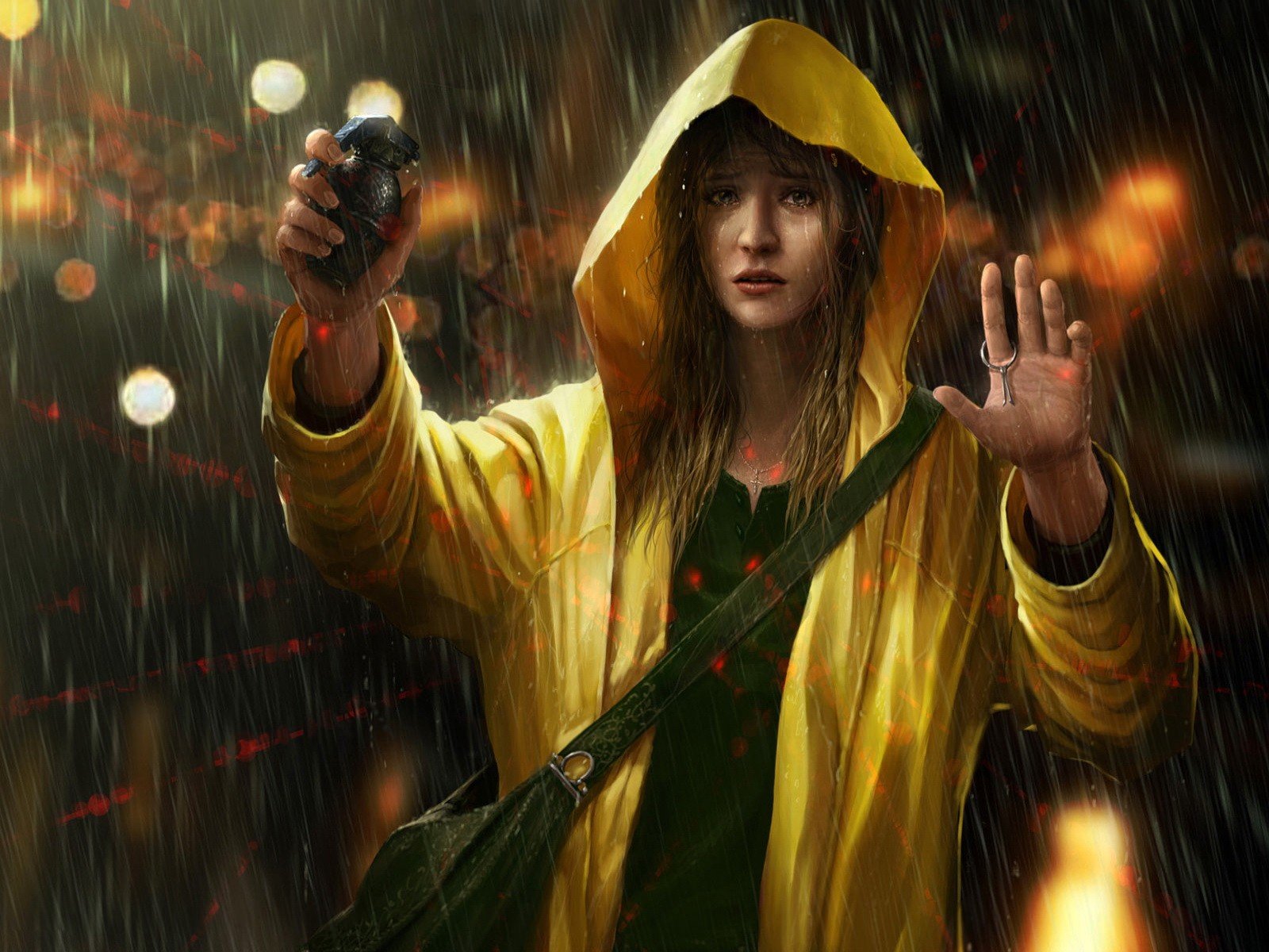 Fille dans un manteau avec des armes entourées de fuméeFille dans un manteau avec des armes entourées de fumée