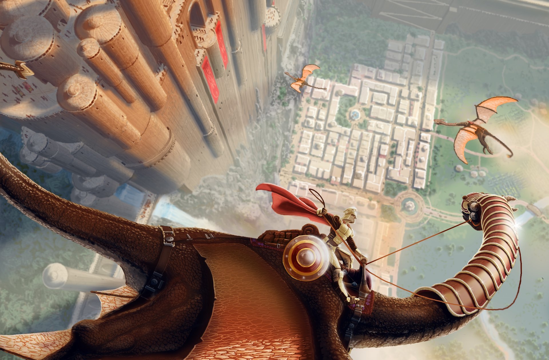 Fantasy: le vol d'un cavalier en armure sur un dragonFantasy: le vol d'un cavalier en armure sur un dragon