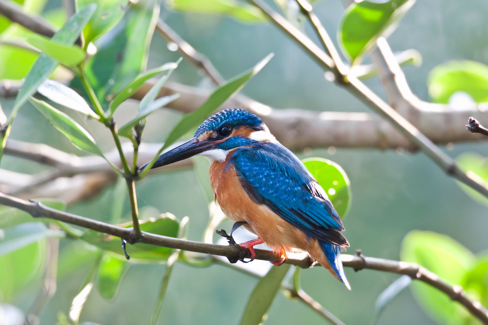Un Martin-pêcheur est assis sur une branche avec des feuilles vertes