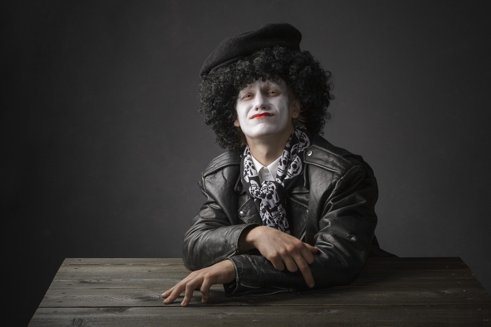 Stylisation sous un clown dans une perruque, un chapeau, un masqueStylisation sous un clown dans une perruque, un chapeau, un masque