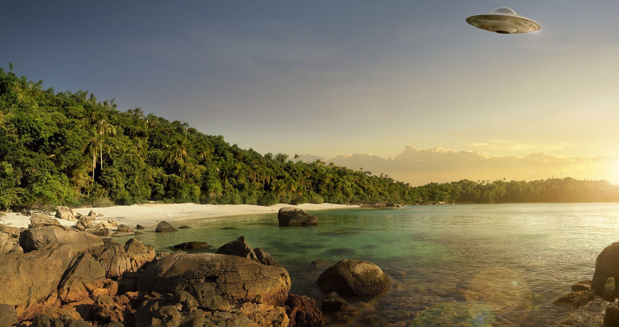 Ovni au-dessus de la mer de palmiers et de la côte de sableOVNI au-dessus de la mer de palmiers et de la côte de sable