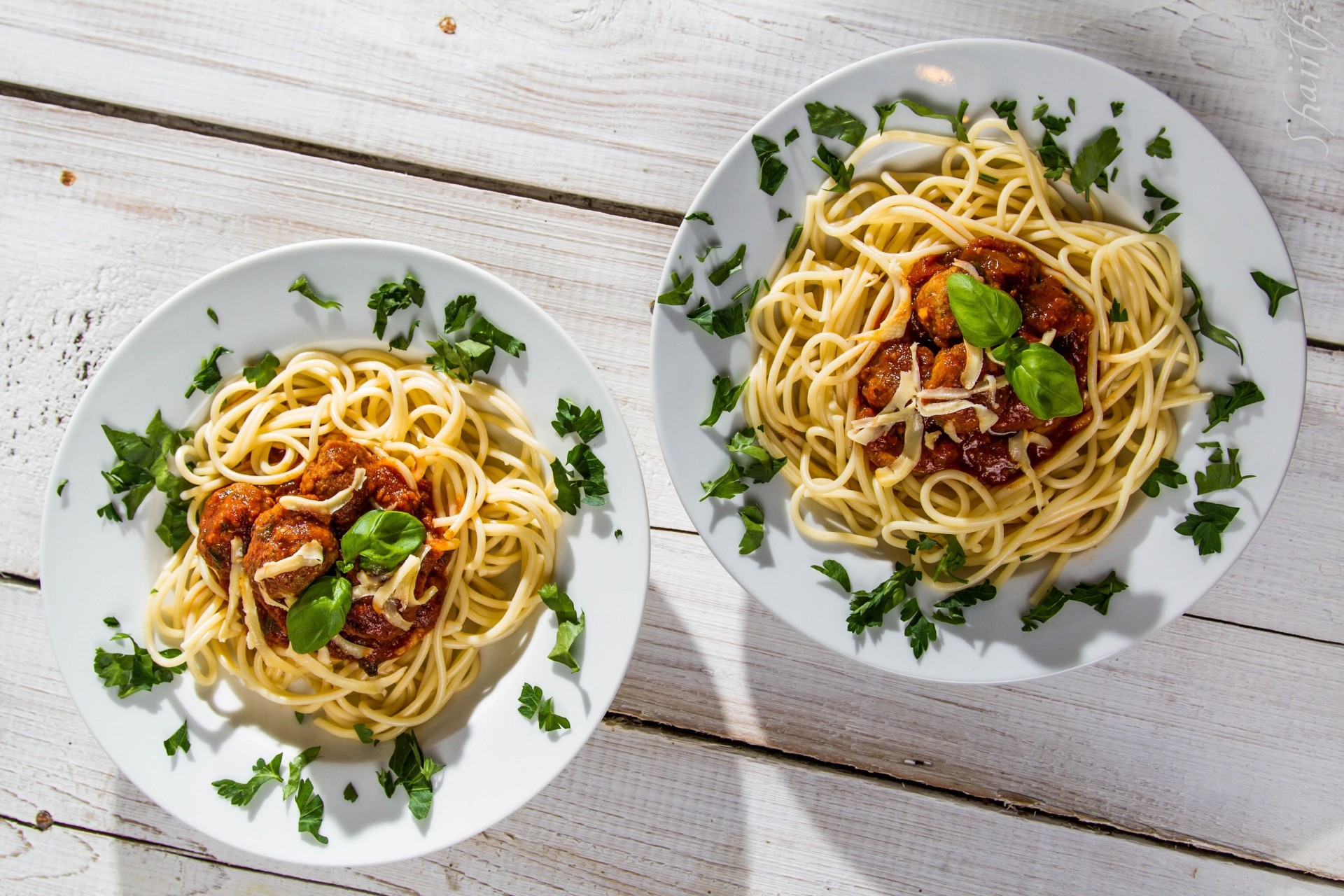 Spaghetti bolognaise aux légumes verts dans des assiettes