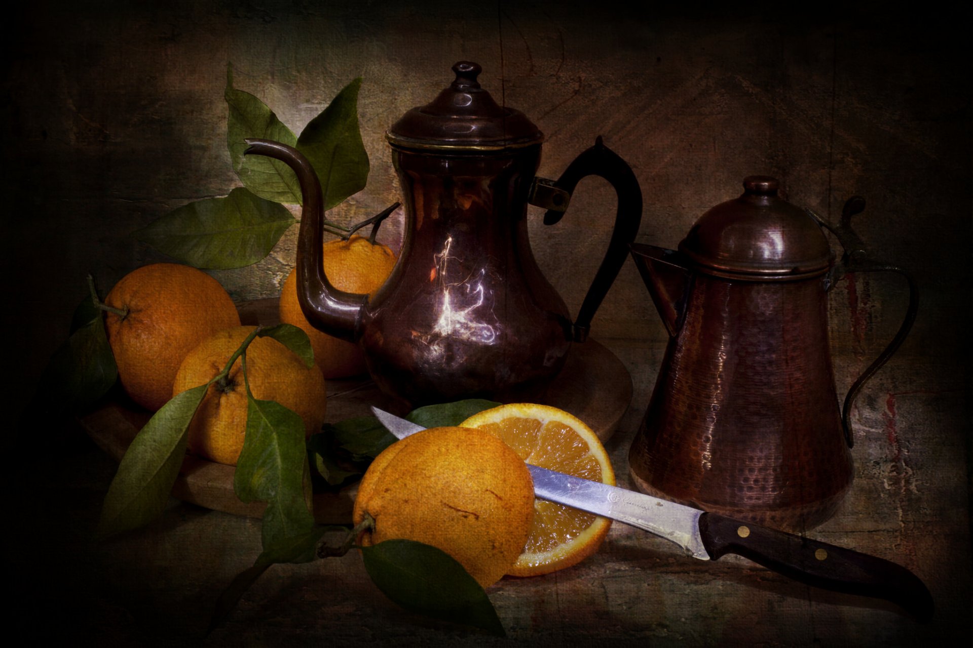 Nature morte vintage avec vaisselle en cuivre et orangesNature morte Vintage avec vaisselle en cuivre et oranges