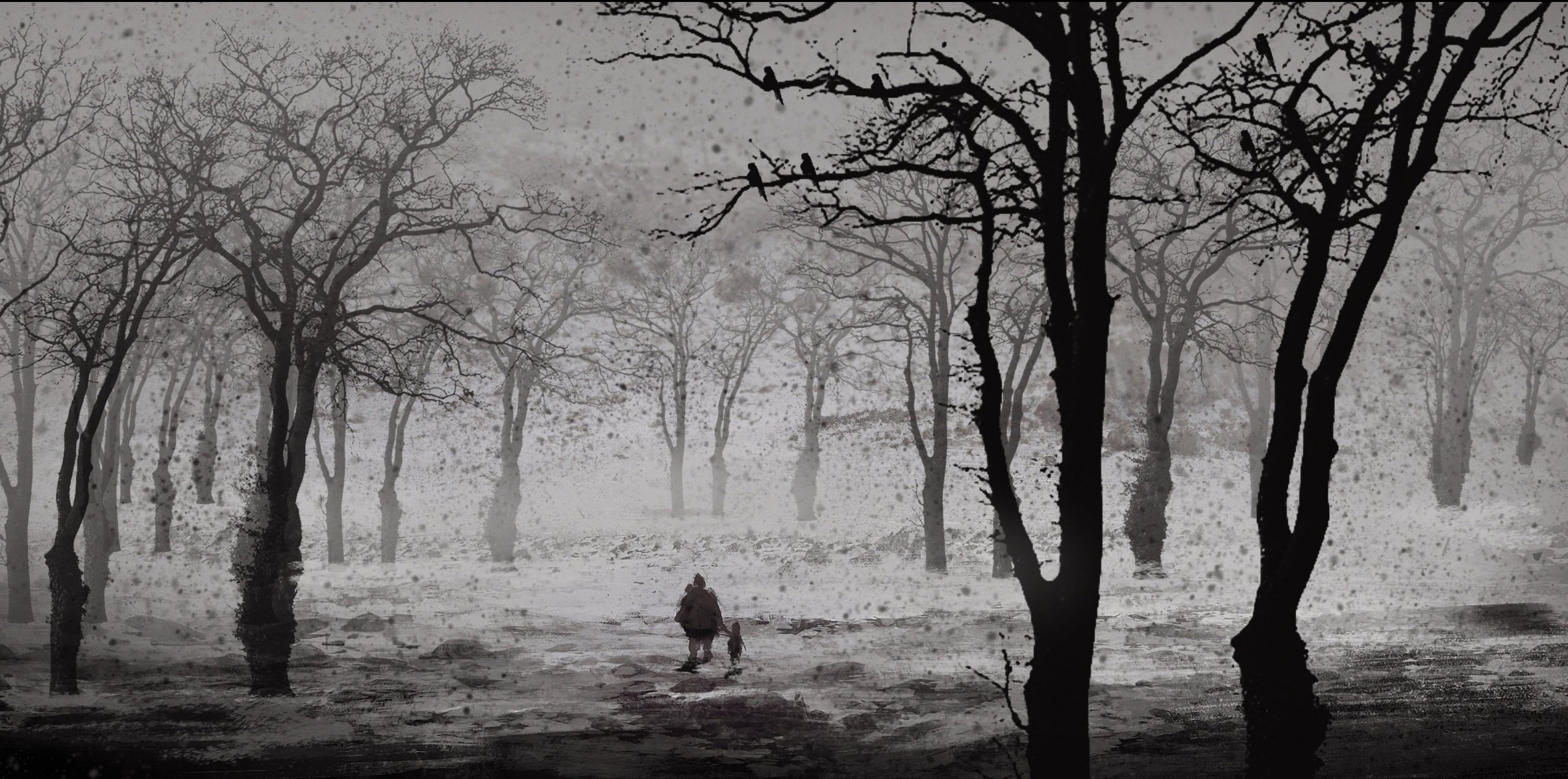 Adulte et enfant dans la forêt peinte en noir et blancAdulte et enfant dans la forêt peinte en noir et blanc