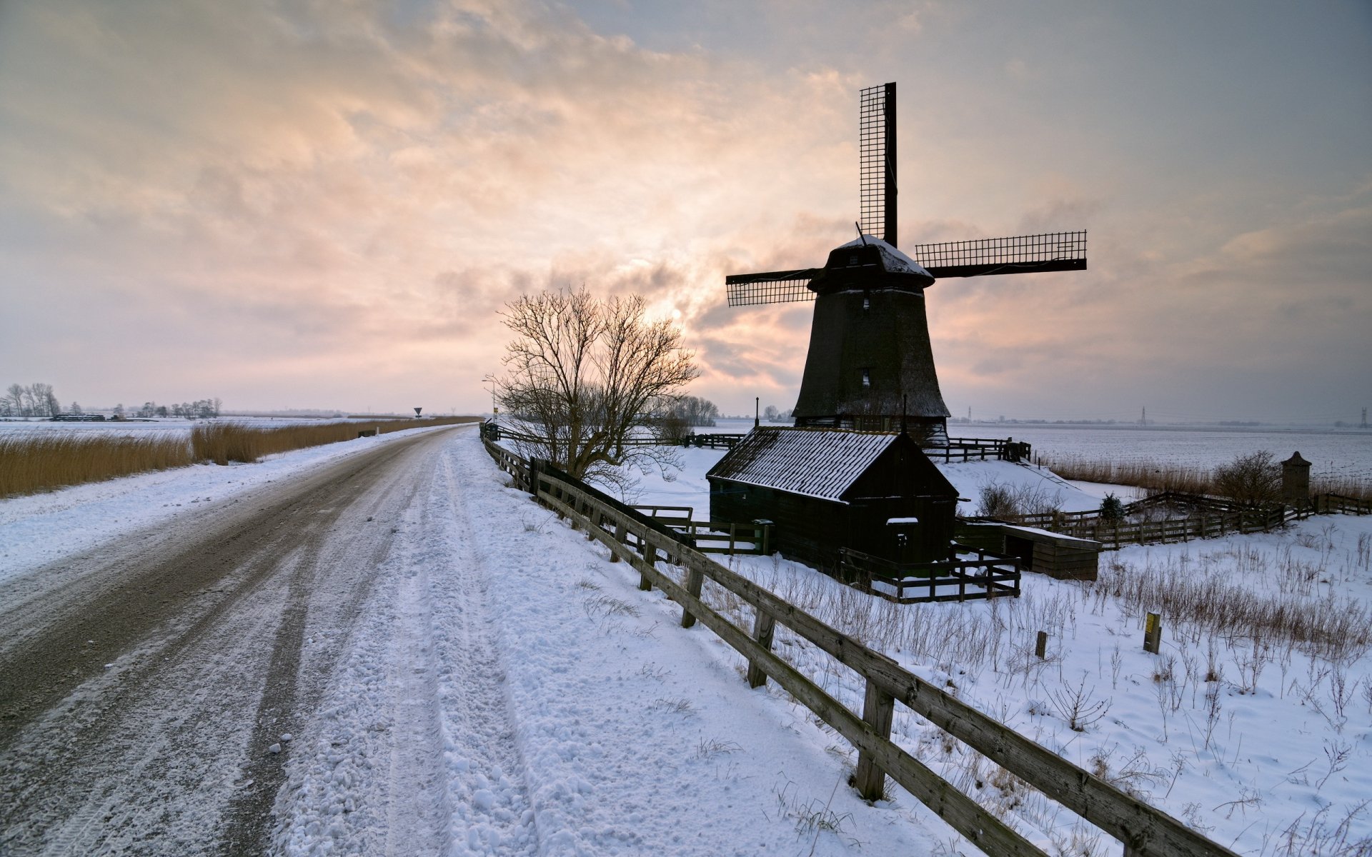 Moulin à vent sur fond de coucher de soleil d'hiverMoulin à vent sur fond de coucher de soleil d'hiver