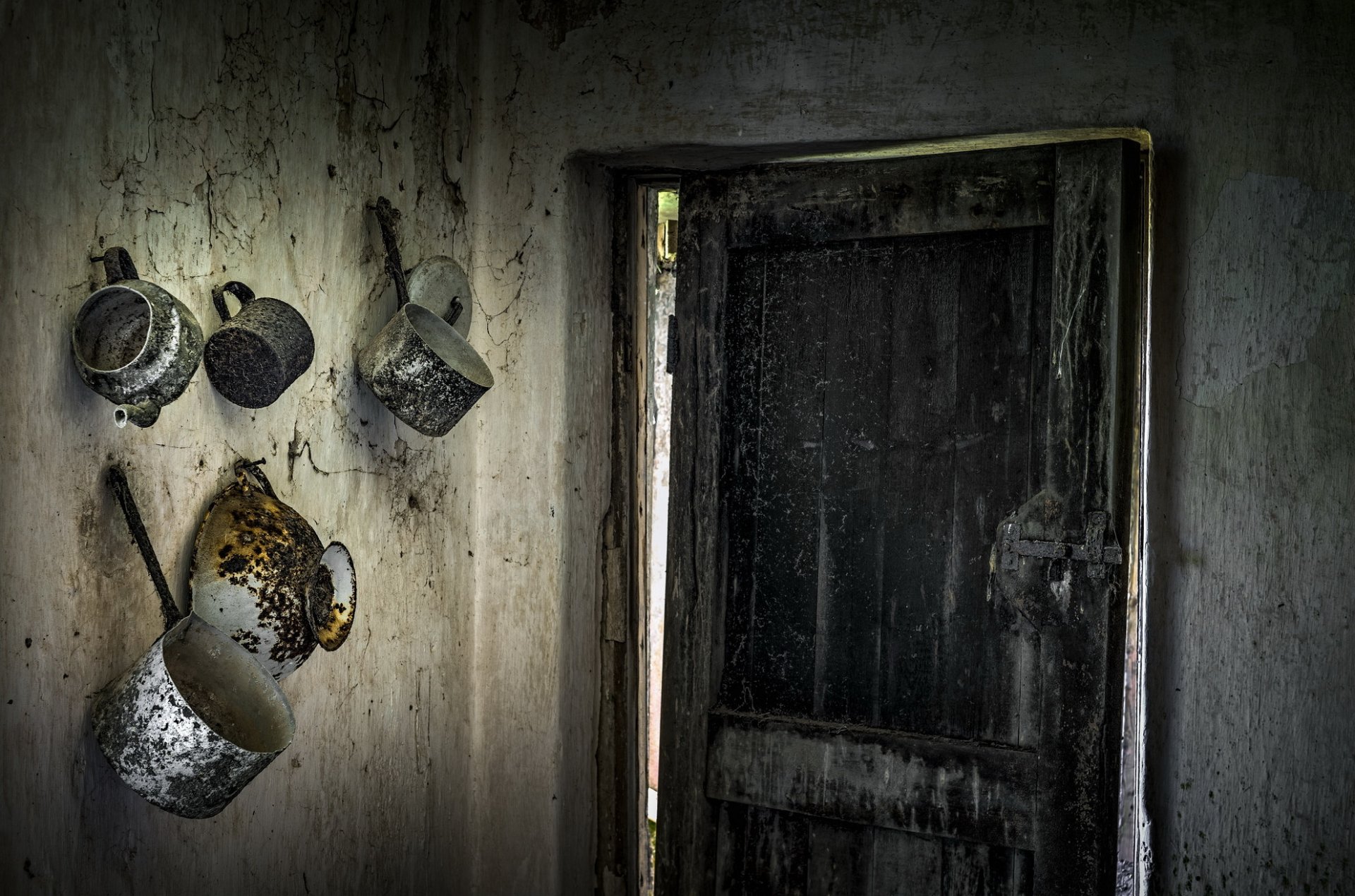 Vieille porte dans la chambre avec de la vaisselle sale sur le mur