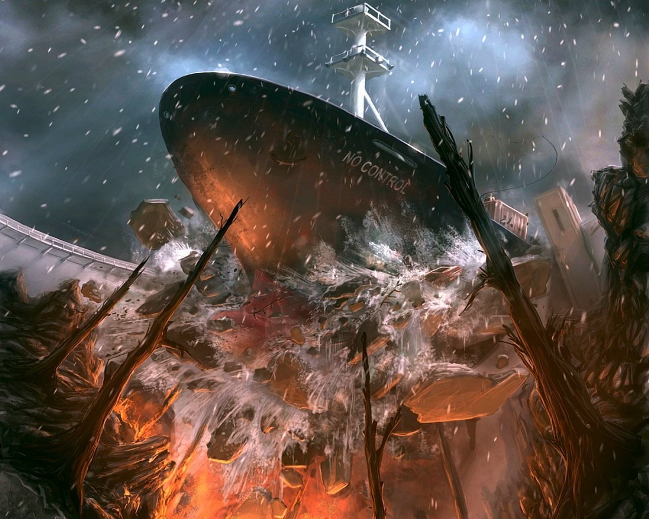 Une pieuvre géante a capturé le navire. missile. fond vertUne pieuvre géante a capturé le navire. Missile. Fond vert