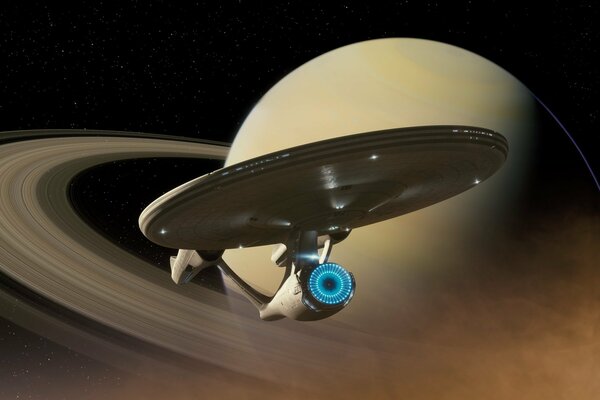 Vaisseau spatial dans l'espace ouvert sur le fond de la planète saturneVaisseau spatial dans l'espace ouvert sur le fond de la planète Saturne