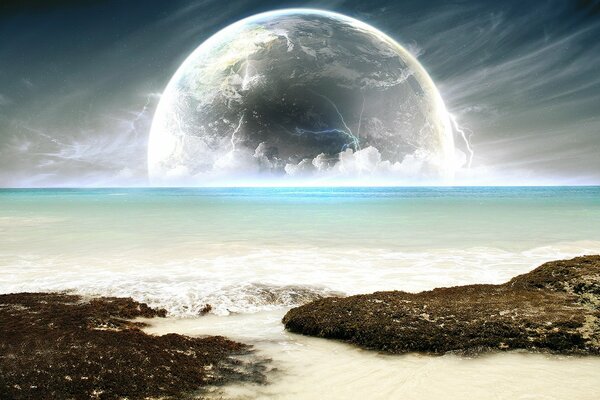 L'espace de la planète est en relief, la surface est remplie de lumière, l'atmosphère est sombreL'espace de la planète est en relief, la surface est remplie de lumière, l'atmosphère est sombre