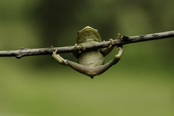 Photo de gros plan d'une grenouille suspendue sur une branchePhoto de gros plan d'une grenouille suspendue sur une branche