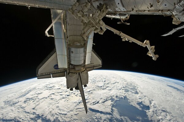 Art sur le thème de l'espace avec un vaisseau en orbite près de la planèteArt sur le thème de l'espace avec un vaisseau en orbite près de la planète