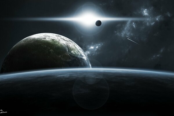 Satellite volant dans l'espace non loin de la planèteSatellite volant dans l'espace non loin de la planète