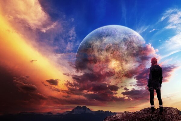 Photo dans l'espace en trois dimensions sur le fond de la planètePhoto dans l'espace en trois dimensions sur le fond de la planète