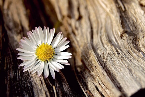 Photo de gros plan d'une fleur de camomille blanche dans un tronc d'arbre secPhoto de gros plan d'une fleur de camomille blanche dans un tronc d'arbre sec