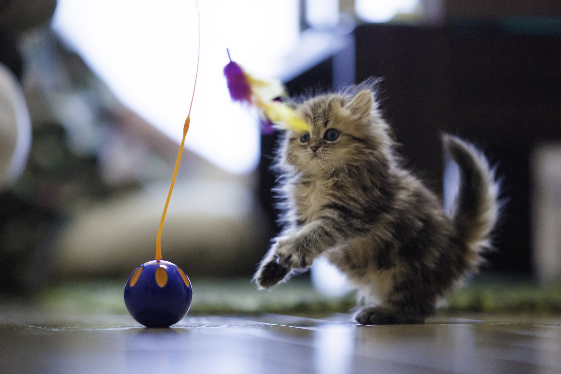 Daisy joue sur le sol avec une boule et des plumesDaisy joue sur le sol avec une boule et des plumes