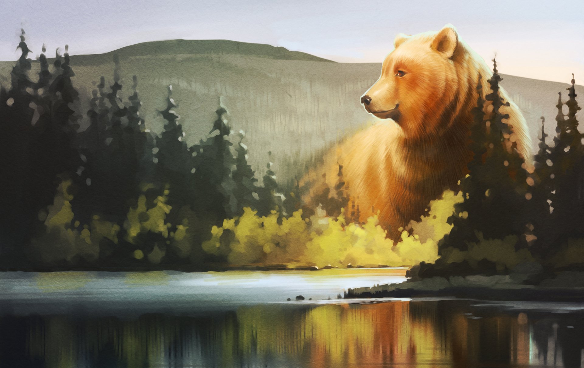 Un énorme ours se dresse au-dessus du lac et de la forêtUn énorme ours se dresse au-dessus du lac et de la forêt