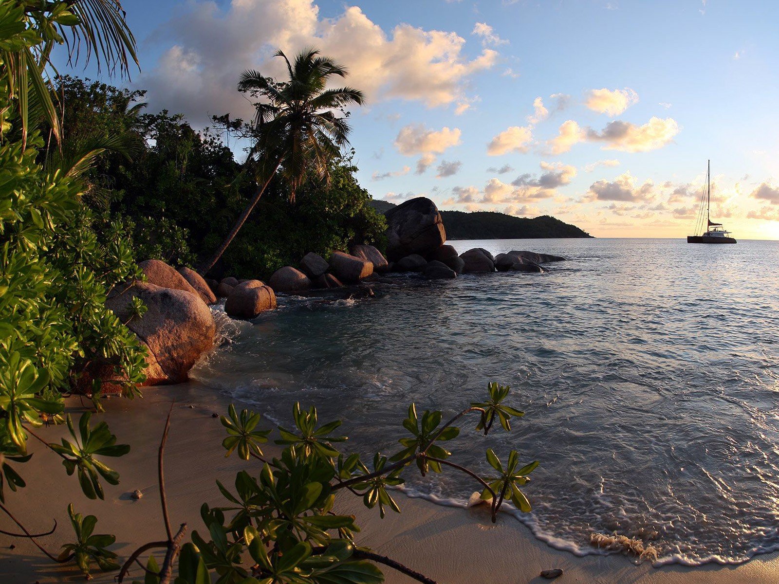 Rivage avec des pierres et des palmiers, bateau sur fondRivage avec des pierres et des palmiers, bateau sur fond