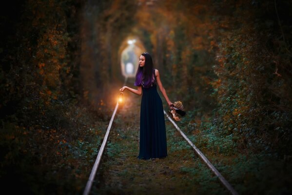 La jeune fille au coucher du soleil va par le chemin de ferLa jeune fille au coucher du soleil va par le chemin de fer