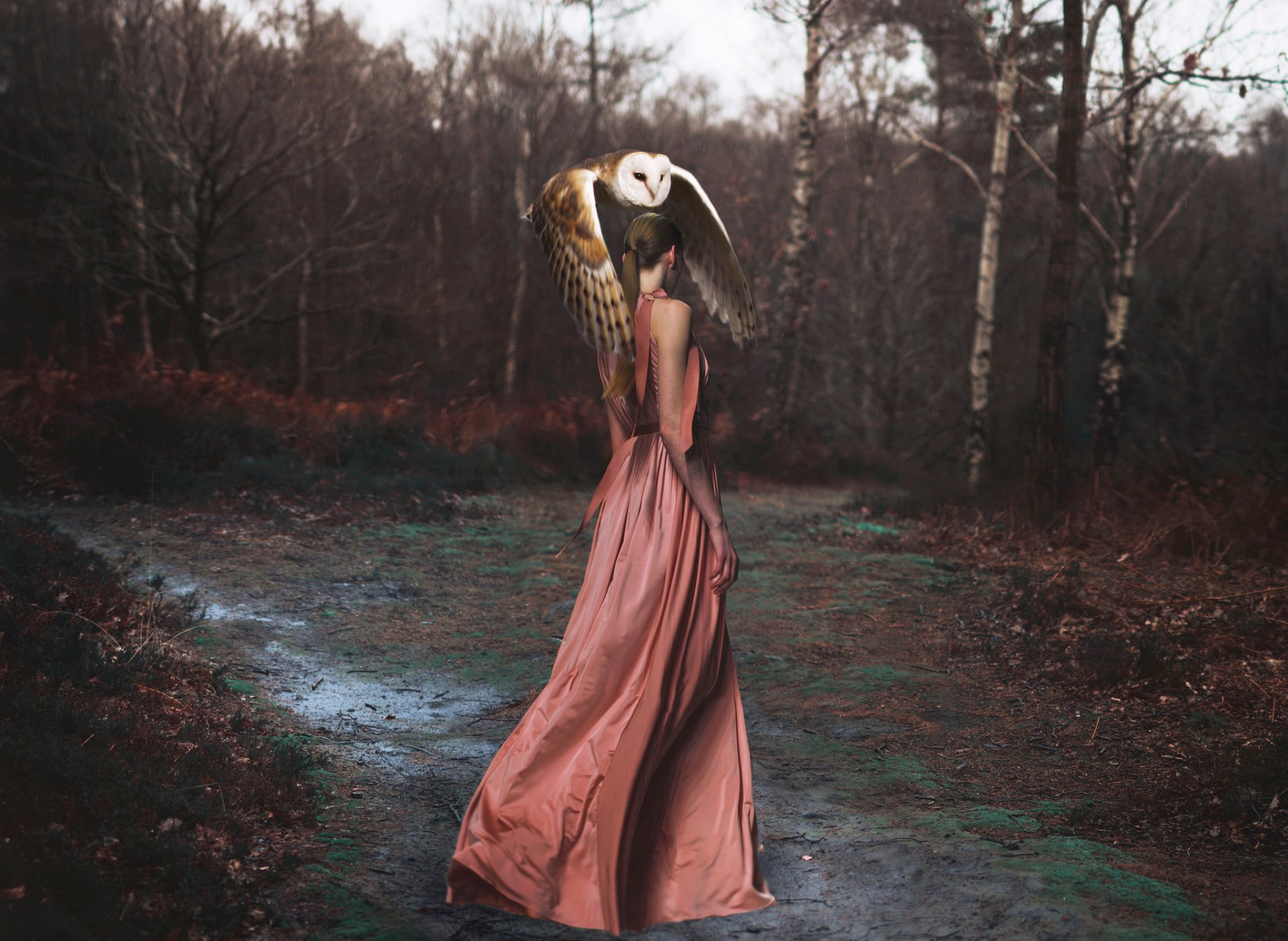 Photo mystérieuse d'une fille en robe rose dans la forêt avec un hibouPhoto mystérieuse d'une fille en robe rose dans la forêt avec un hibou