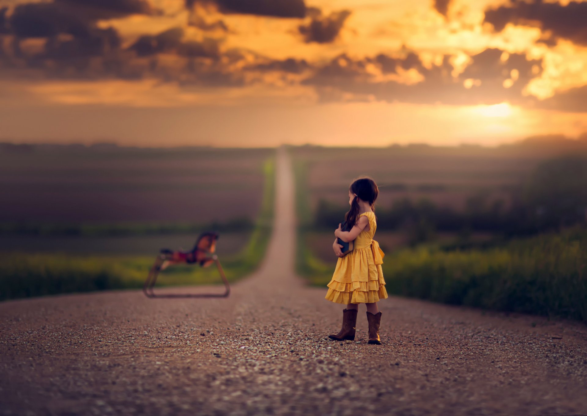 La petite fille dans ses bottes sur la route regarde le jouet de cheval