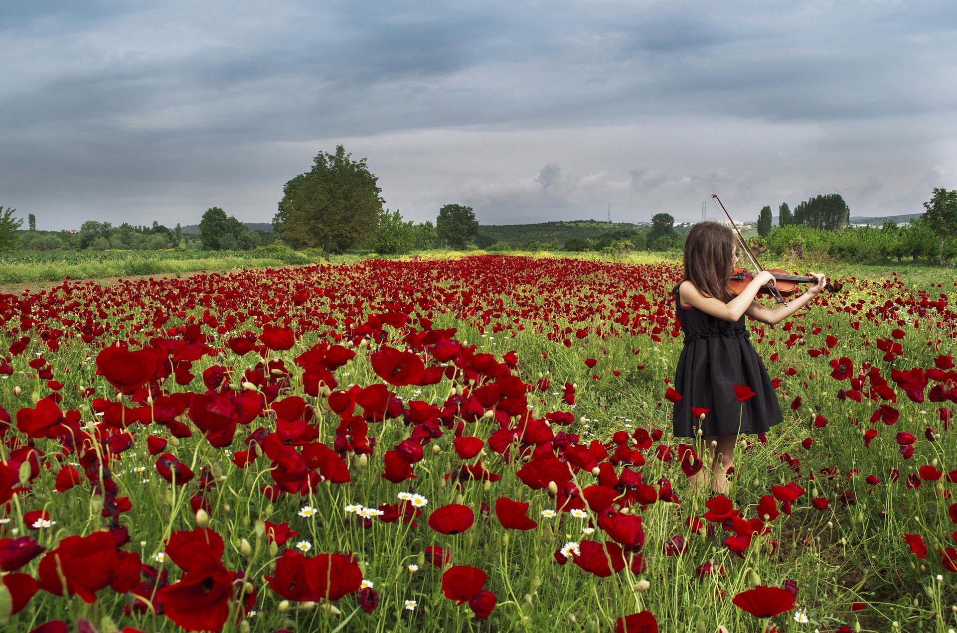 Petite fille jouant du violoncelle près de coquelicotsPetite fille jouant du violoncelle près de coquelicots