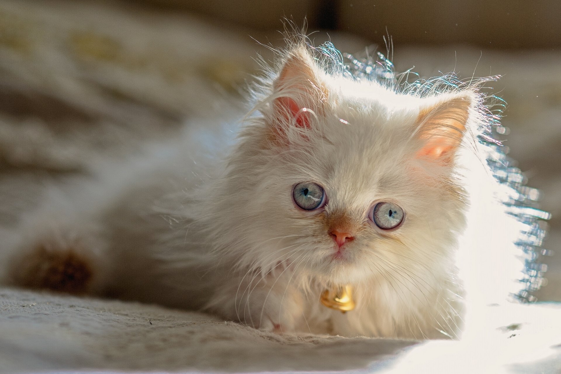 Chaton aux yeux bandés blanc avec un tambourin autour du cou
