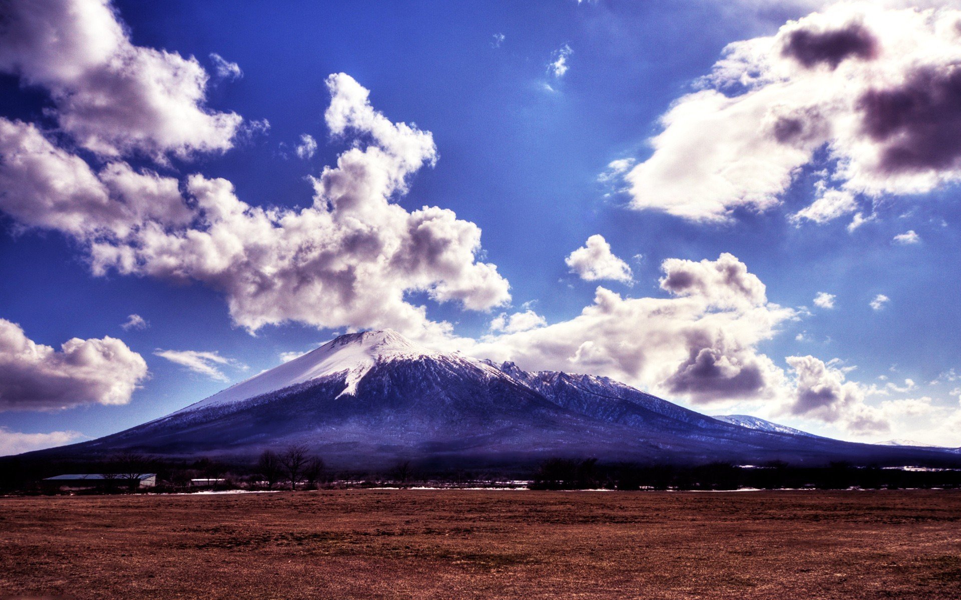 Arbres en fleurs sur fond de montagne et de nuagesArbres en fleurs sur fond de montagne et de nuages