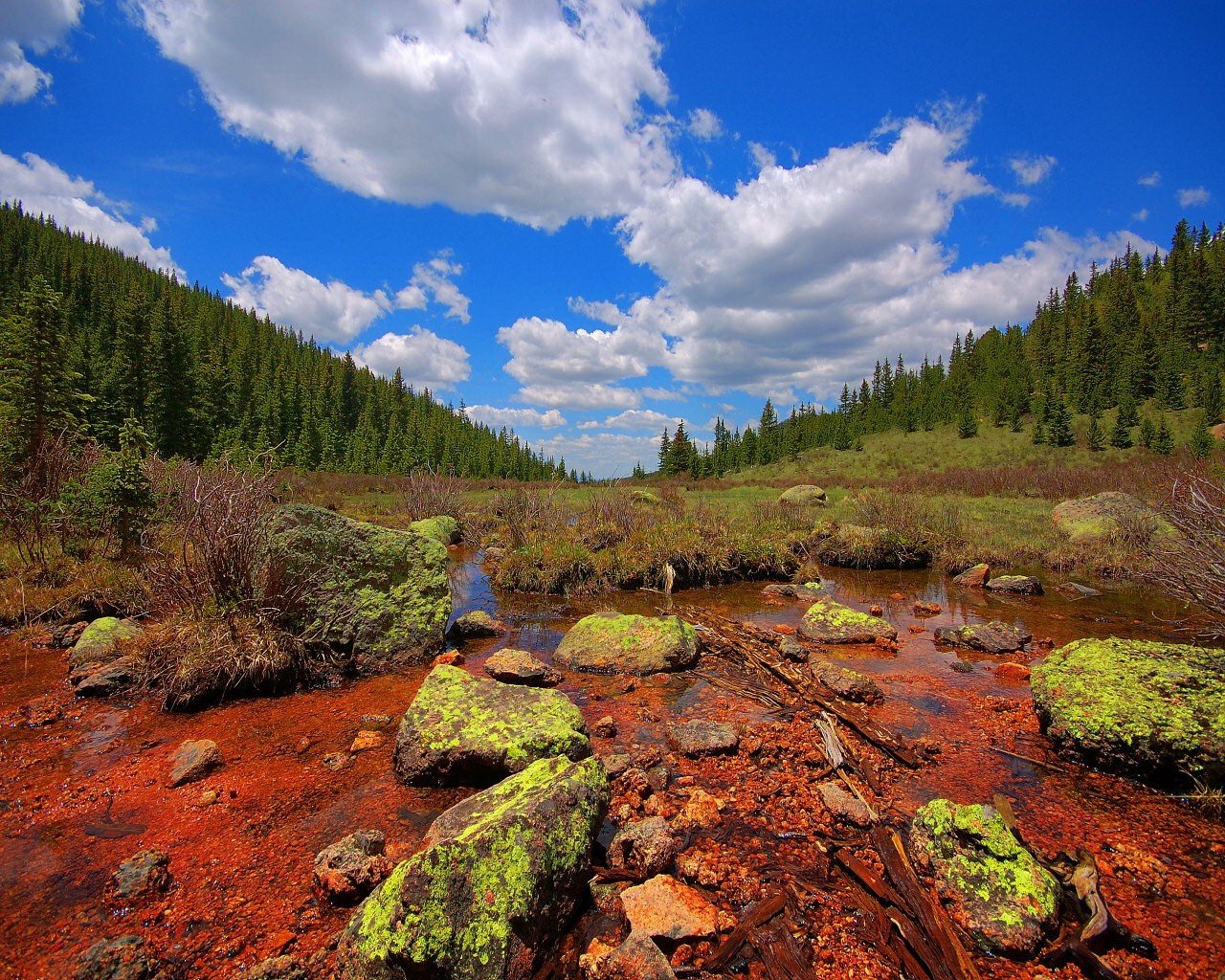 Cascade parmi les pierres et l'herbe dans les montagnes