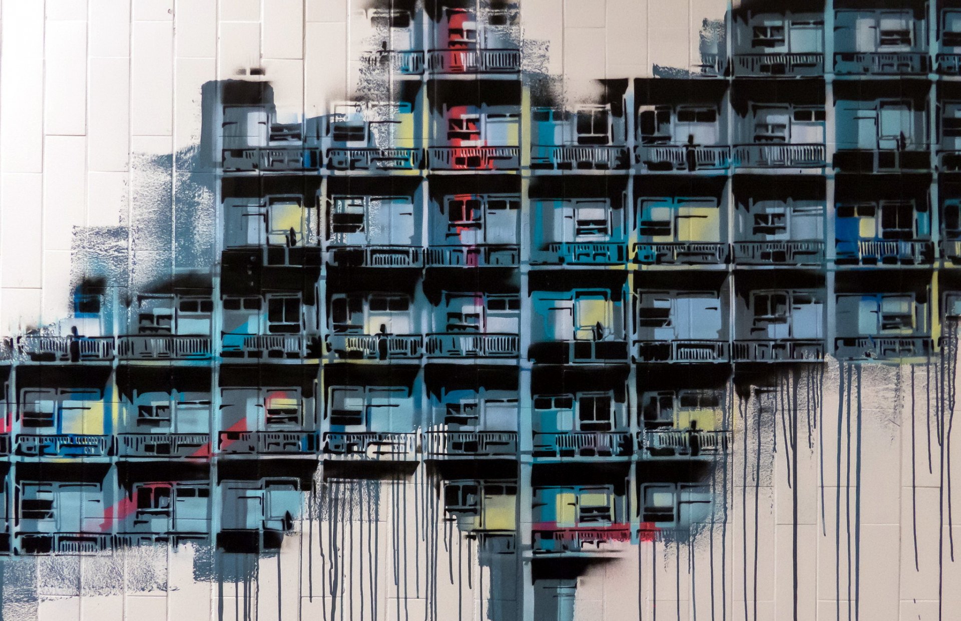 Moto blanche et bleue sur un parking à plusieurs étagesMoto blanche et bleue sur un parking à plusieurs étages