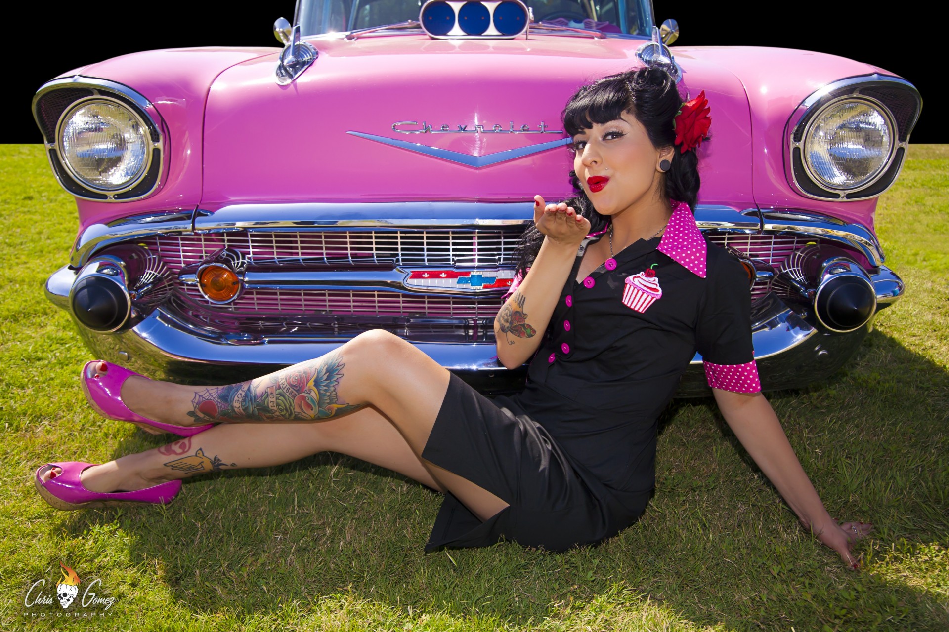 Fille avec des tatouages à côté d'une voiture rose Chevrolet