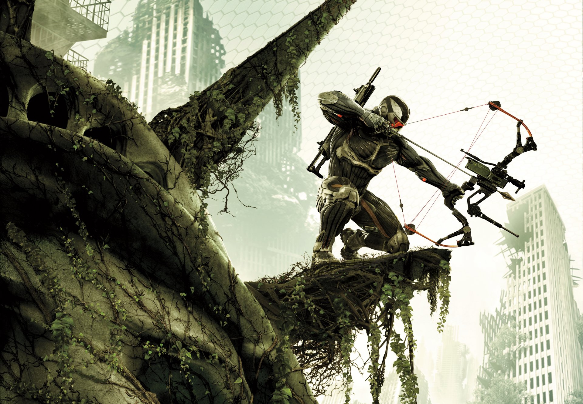 Jeu de tir crysis 3 par crytek soldat en nanocostume sur le fond d'une ville détruite