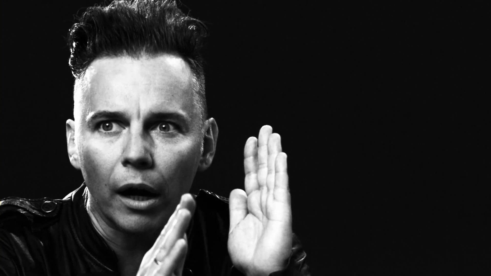 Photo en noir et blanc d'un homme gesticulant surprisPhoto en noir et blanc d'un homme gesticulant surpris