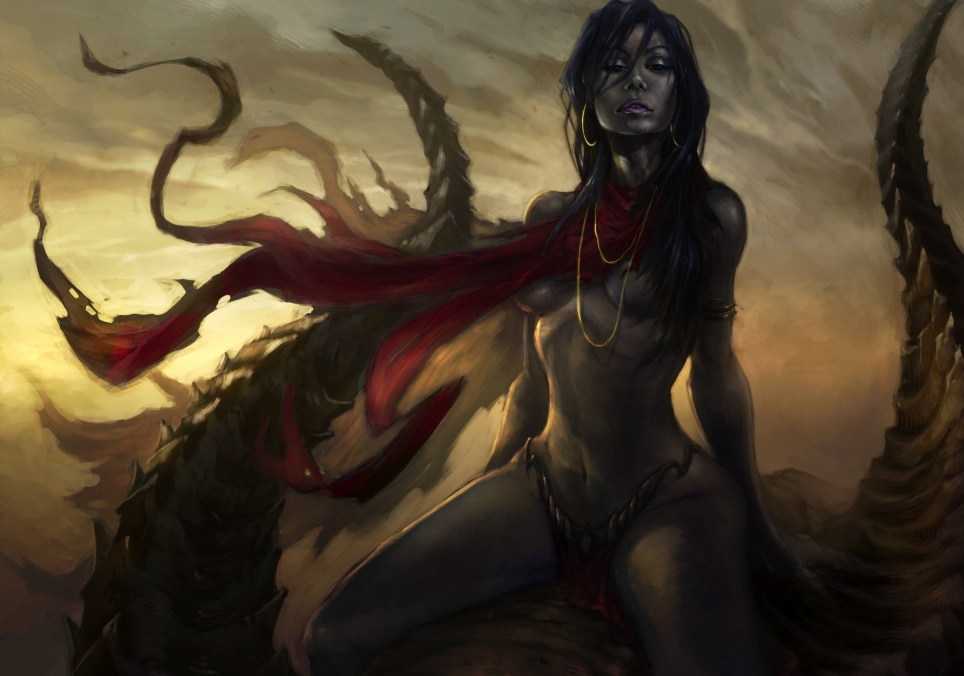 Art art, fille en position assise, autour du cou décoration iveter développe une écharpe sanglante, éveille la fantaisieArt art, fille en position assise, autour du cou décoration iveter développe une écharpe sanglante, éveille la fantaisie