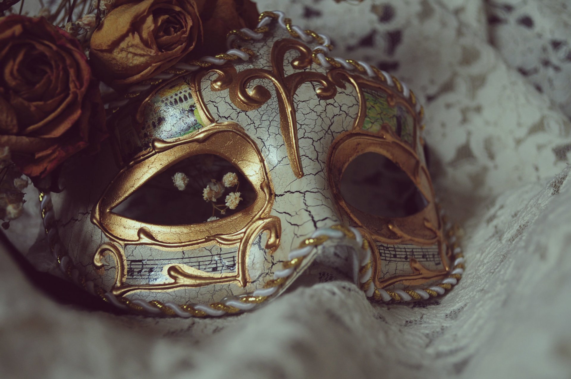 Une bouteille de champagne et deux verres de couleur argentée à côté d'un masque de carnaval