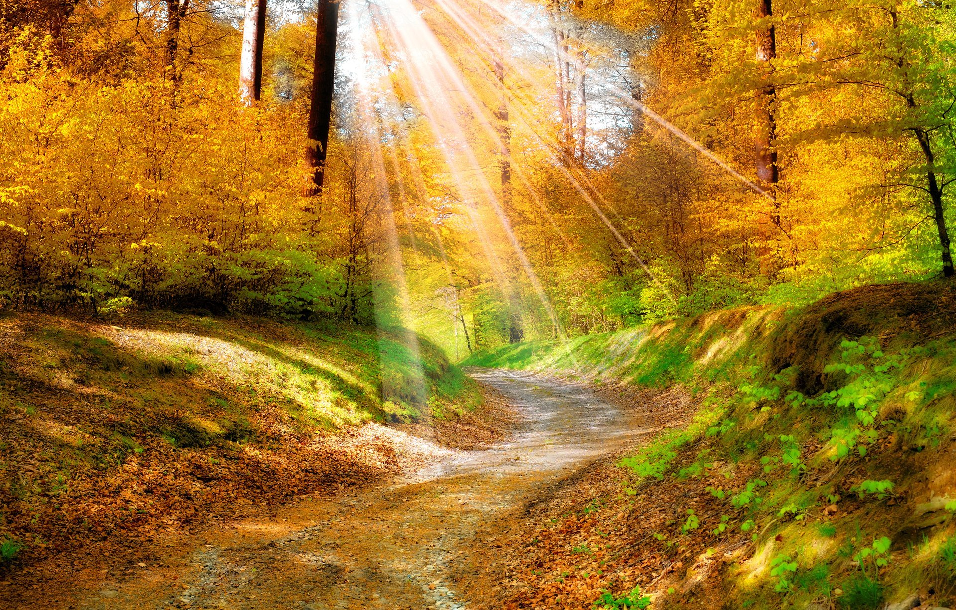 Les rayons du soleil se frayent un chemin à travers les arbres de la forêt
