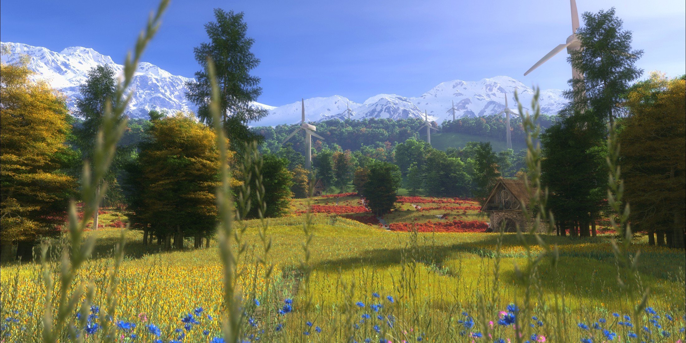 L'art de prairies de fleurs sur fond de montagnes