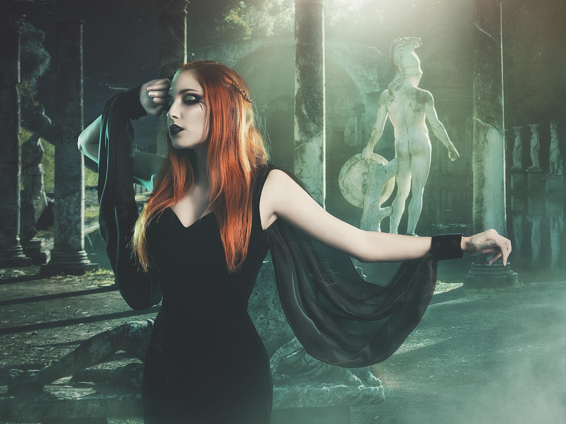 Fille en noir sur fond de statue